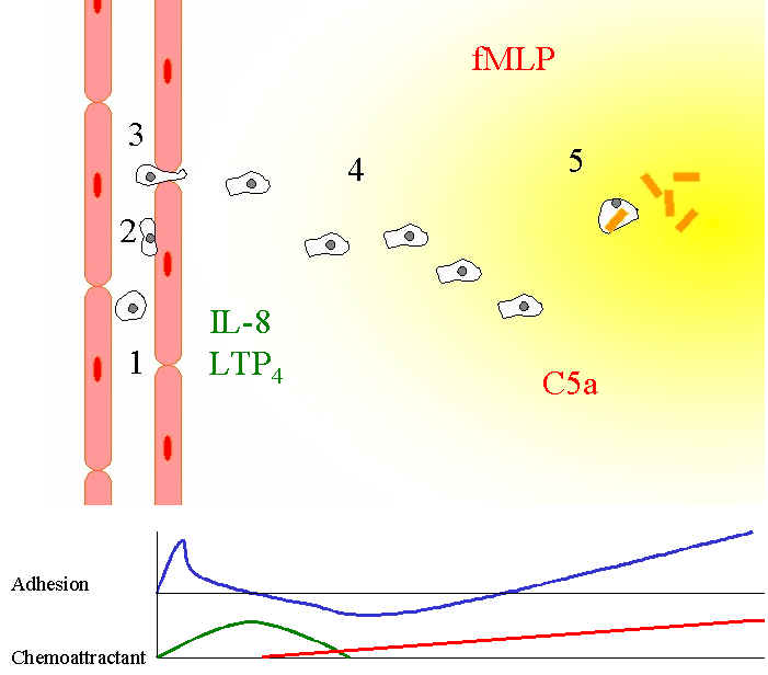 the neutrophils crawl in the 3-dimension matrix. Adhesion then increases with fMLP/C5a gradient.
