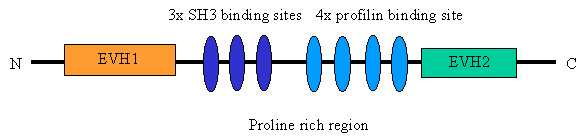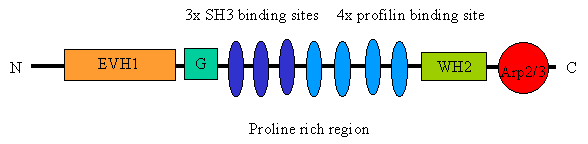 (Cyan). There are three SH3 binding sites (blue) and 4 profilin binding