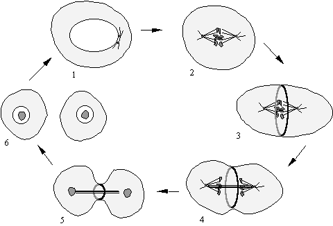 poles form. 3. Cleavage furrow (contractile ring) assembles. 4. Cleavage furrow
