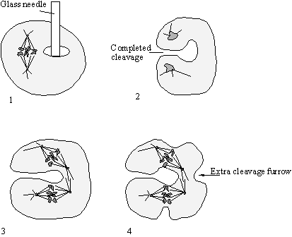 spindle now dictates the formation of an extra cleavage furrow. Note that this results in four cells as would