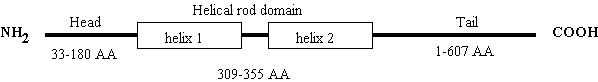 Intermediate Filaments (IFs), are so called because, at 10nm in diameter they are typically intermediate in size between microfilaments and microtubules. IFs are different to microfilaments and microtubules in a number of fundamental respects. First of all they tend to be more or less permanent structures in tissues such as skin and hair, in fact in these non-living tissues IF proteins are almost the only protein. Thus it is true (but a little sad) to say that beauty is only IF thick! In other cell types, IFs are modified by phosphorylation when they are required to be disassembled for example during cell division. Unlike the highly conserved actins and tubulins more than 40 distinct IF proteins are encoded by a number of genes in mammalian cells. All IF proteins have a similar structure with a central helical rod domain and more variable head and tail domains. The IFs can be divided into five major classes:-