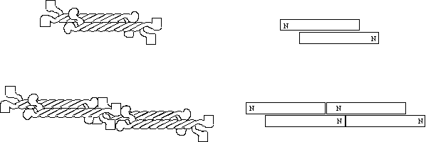 The IF dimers now associate with other dimers in an anti-parallel fashion so that there are now two N and two C termini at each end of the complex to form a tetramer (top). The next step is the association of the N terminal head of one tetramer with the C terminal tails of another. IF assembly can then proceed in this manner infinitely. It should be noted that the above scheme is somewhat tentative and lacks firm evidence. It is not clear for example exactly which domains are responsible for tetramers binding end to end.